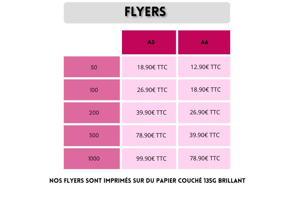 Le flyer est le choix parfait pour mettre en lumière votre message de manière élégante et professionnelle. Imprimé sur un papier de haute qualité, il offre une texture lisse et une résistance optimale, garantissant une durabilité supérieure. Que vous souhaitiez promouvoir votre entreprise, un événement spécial, ou présenter un nouveau produit, nos flyers classiques sont la toile idéale pour votre créativité. L’accent est mis sur la clarté et la netteté de l’impression, assurant que vos images et textes se démarquent avec une précision remarquable. Vous pouvez choisir parmi une variété de formats et de supports pour personnaliser votre flyer selon vos besoins spécifiques
