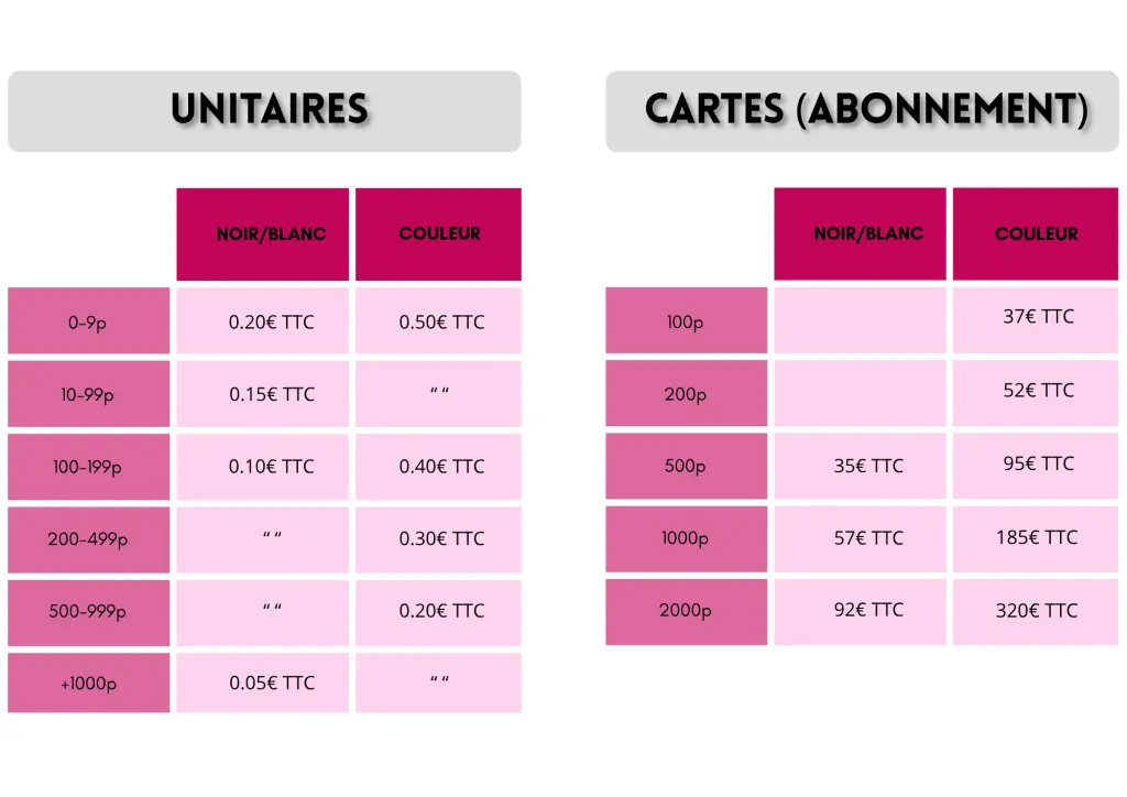 Imprimez vos documents en noir et blanc ou en couleur, directement à partir de vos supports numériques ou d’un simple e-mail contenant le fichier à imprimer. Vous pouvez également acheter vos impressions à l’avance et bénéficier de tarifs préférentiels en fonction du volume commandé*.
