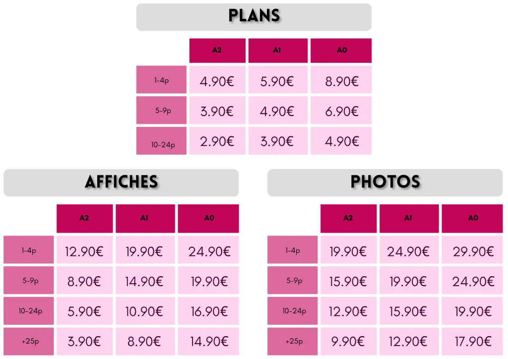 Une nouveauté depuis 2025, les grands formats sont possibles jusqu’au A0+ (914*1292mm) et tous les autres A0 / A1 / A2 et formats personnalisés. Notre traceur EPSON T5700 nous permet de faire des impression d’une qualité irréprochable sur plusieurs supports papiers (papier ordinaire, épais, photo) mais bien d’autres: affiches cartonnées, toiles canvas. Venez imprimer vos plans, photos, images et tout ce dont vous avez besoin!
