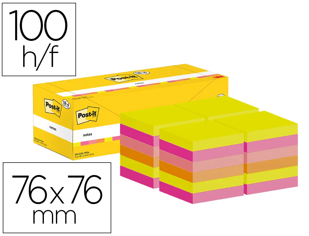 BLOC-NOTES POST-IT 76X76MM 100F REPOSITIONNABLES COLORIS ASSORTIS BOITE 24 BLOCS (18+6 GRATUITS)