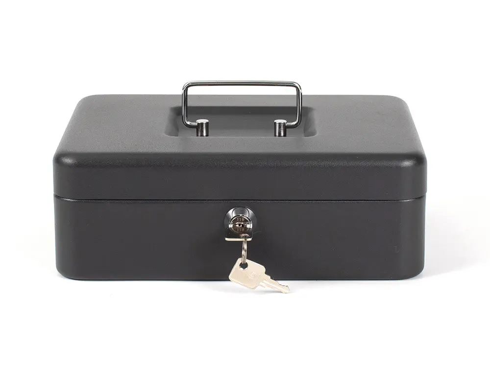 CAISSE MONNAIE Q-CONNECT STRUCTURE ACIER 0.8MM ÉPAISSEUR PLATEAU AMOVIBLE ESPACE BILLETS 250X180X90MM COLORIS NOIR