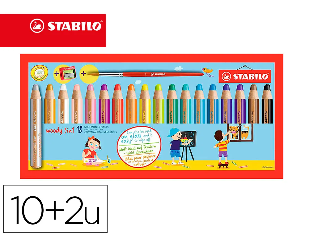 CRAYON COULEUR STABILO WOODY MULTI TALENT 18 CRAYONS 3 EN 1 ARTY +1 PINCEAU ROND TAILLE 8 + 1 TAILLE CRAYON