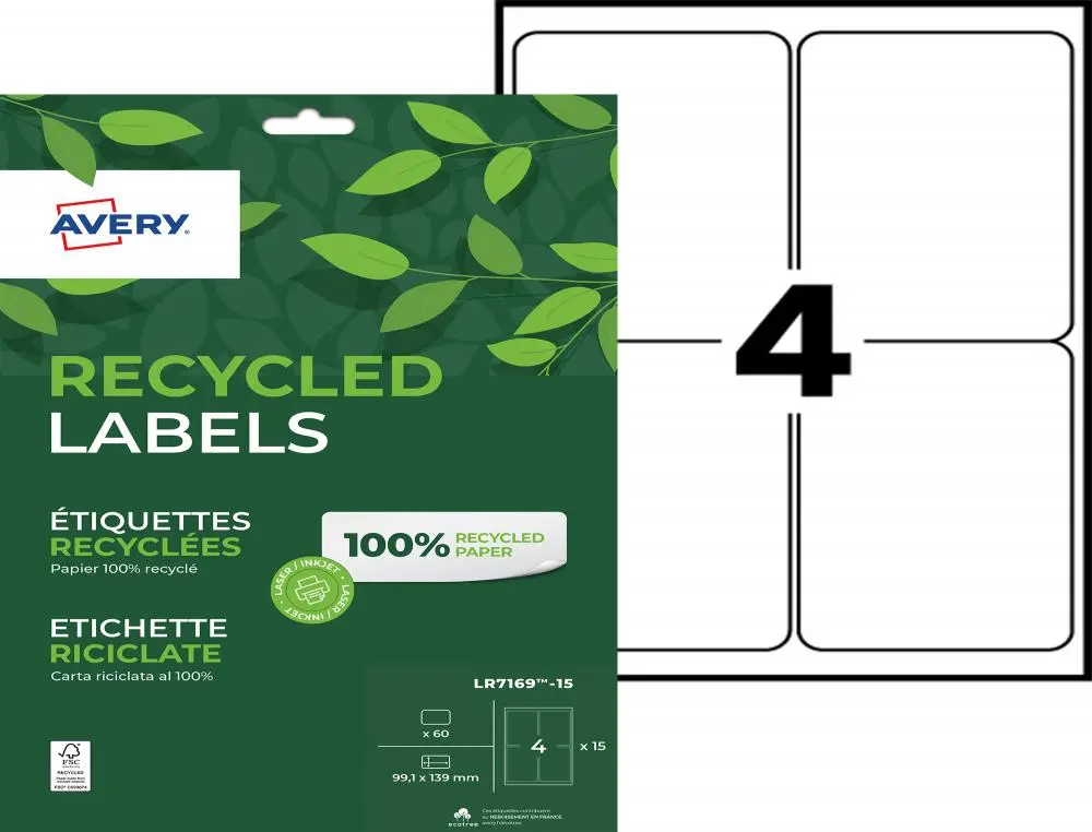 ETIQ.LAS.RECY 99.1X139 15F 60EETIQUETTE RECYCLEE – AVERY – IMPRESSION LASER – 99.1X139MM – 15 FEUILLES