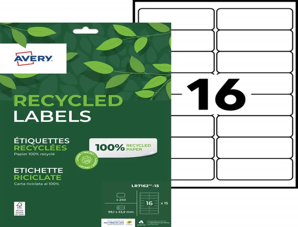 ETIQ.LAS.RECY 99.1X33.9 15F240ETIQUETTE RECYCLEE – AVERY – IMPRESSION LASER – 99.1X33.9MM – 15 FEUILLES