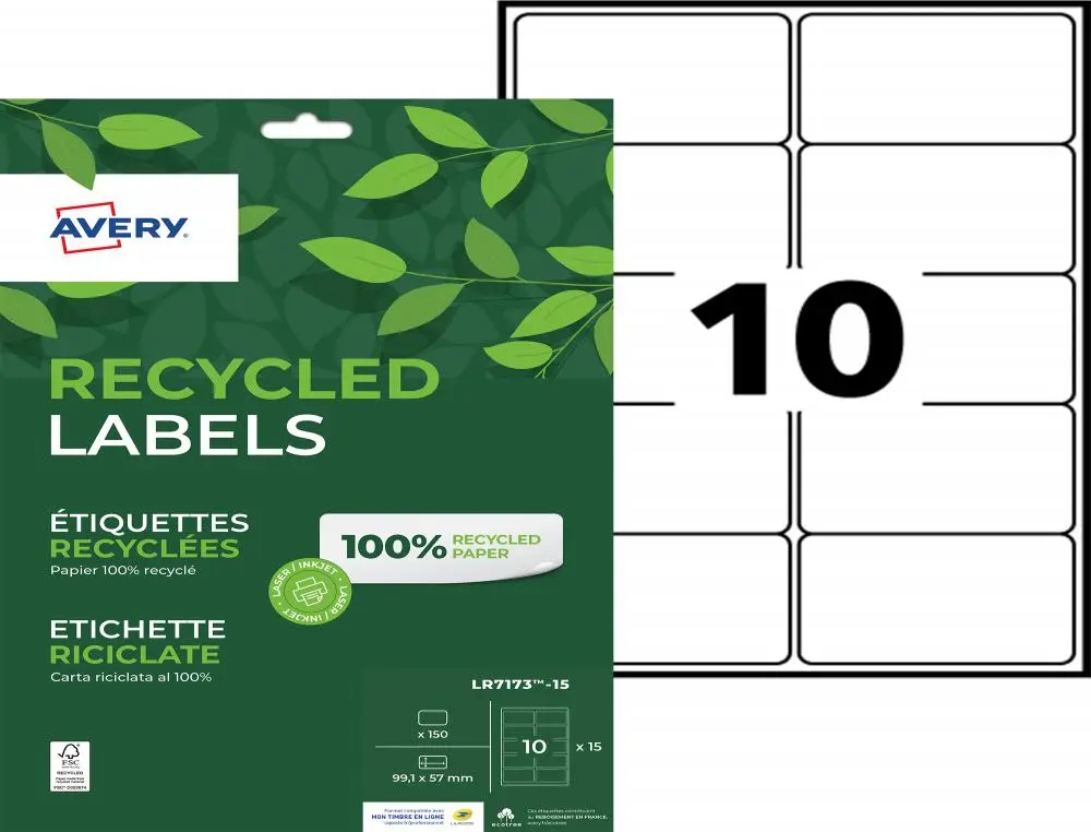 ETIQ.LAS.RECY 99.1X57 15F 150EETIQUETTE RECYCLEE – AVERY – IMPRESSION LASER – 99.1X57MM – 15 FEUILLES