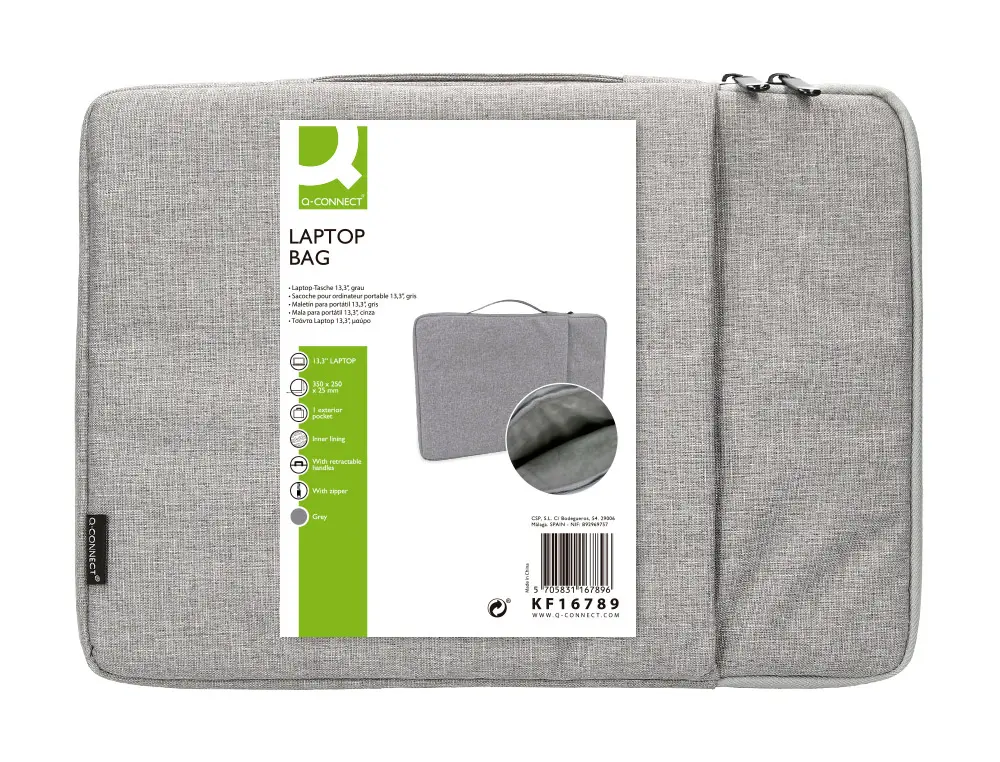 HOUSSE PC 13.3″ Q-CONNECT POIGNEE 1 POCHE EXTERIEURE FERMETURE ECLAIR 350X250X25 MM COLORIS GRIS