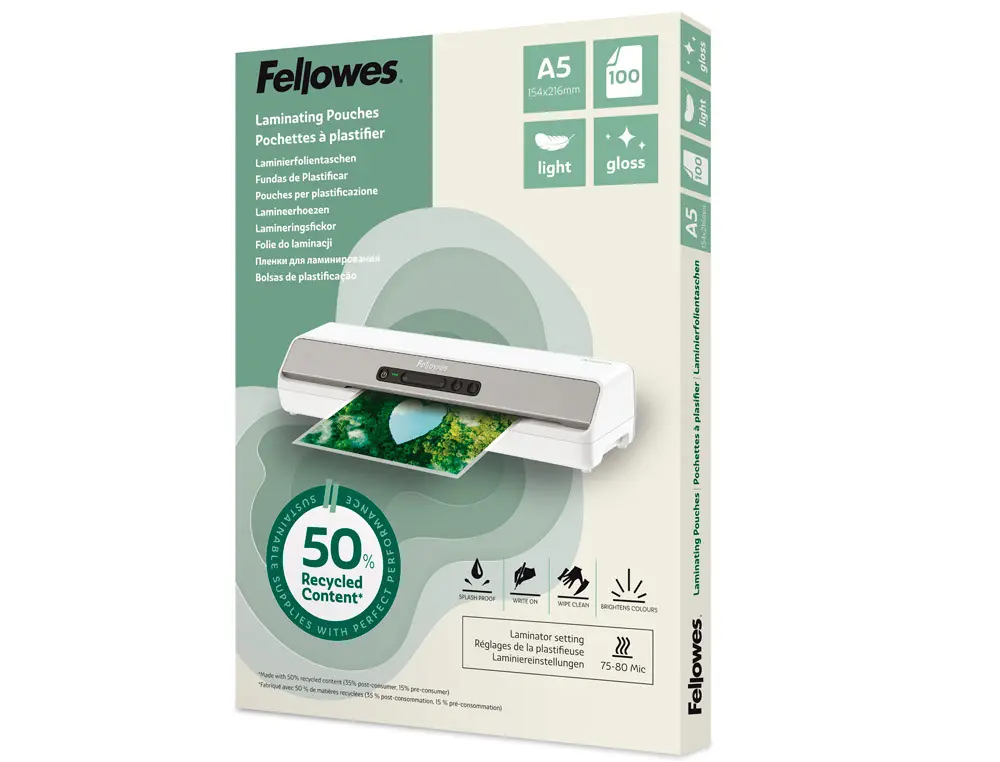 POCHETTE PLASTIFICATION FELLOWES BRILLANTE FORMAT A5 LEGER COLORIS TRANSPARENT BOITE 100 UNITES