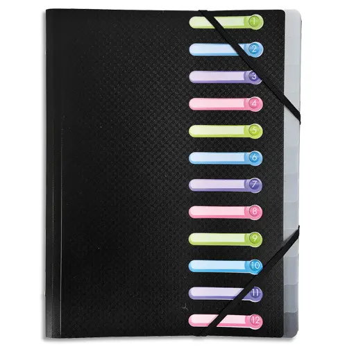 TRIEUR EXACOMPTA 3 RABATS POLYPROPYLÈNE A4+ 12 COMPARTIMENTS FENÊTRES FERMETURE ÉLASTIQUE COLORIS NOIR
